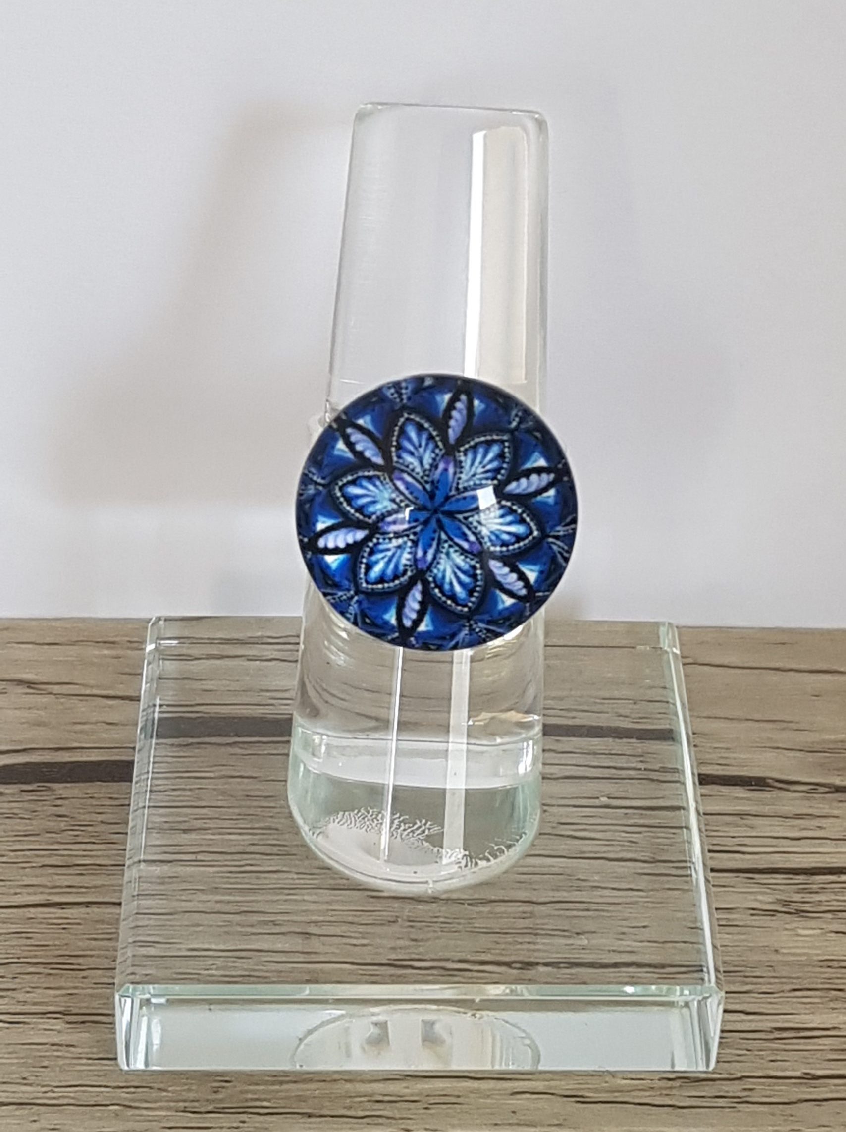 bague réglable ornée d’un cabochon mandala dans les camaïeux de marine, recouvert d’une fine couche de résine.