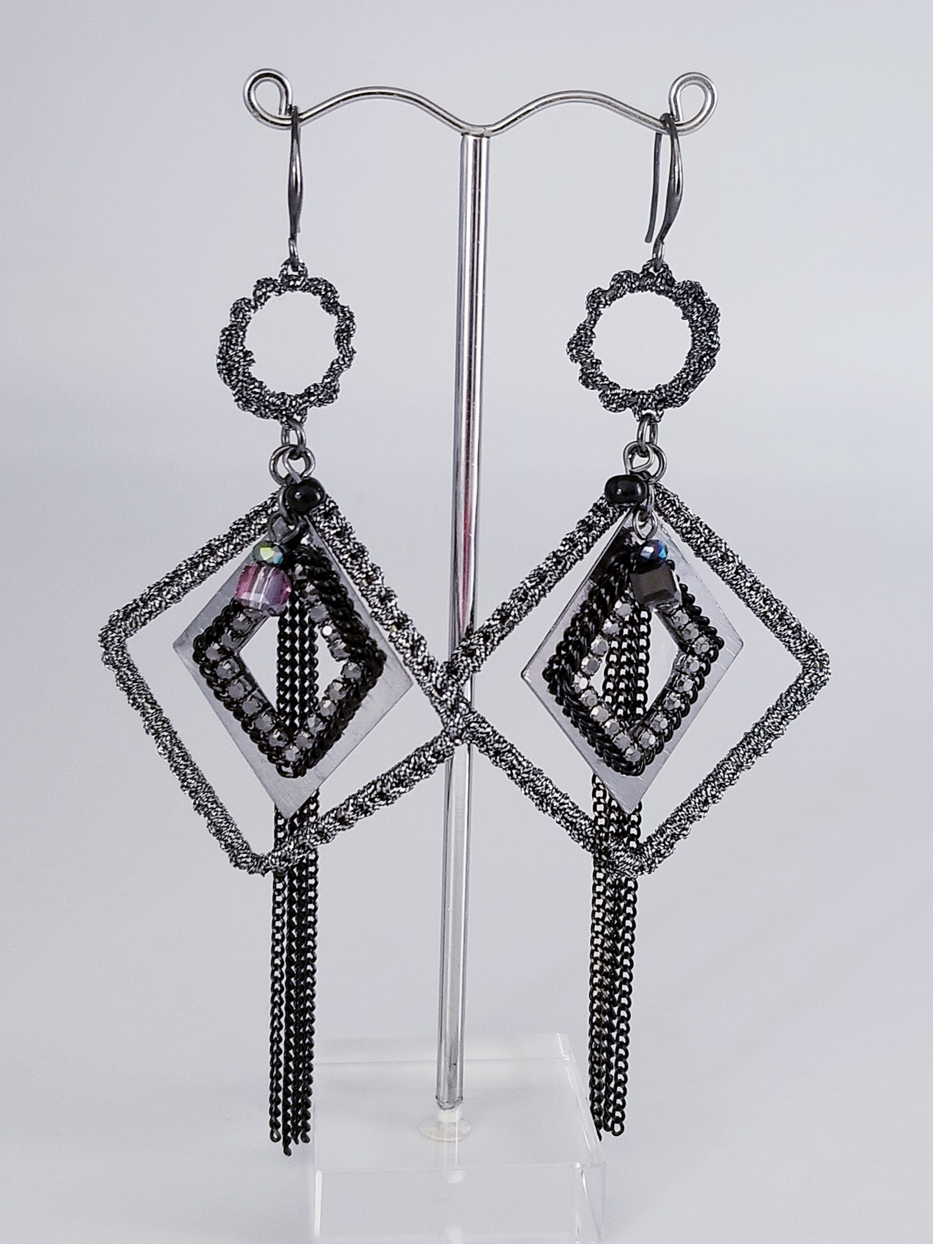 Contraste des tons dans cette paire de boucles d’oreilles en déclinaison de losanges aux camaïeux gris argentés scintillants et les chainettes suspendues noires aux reflets dorés.