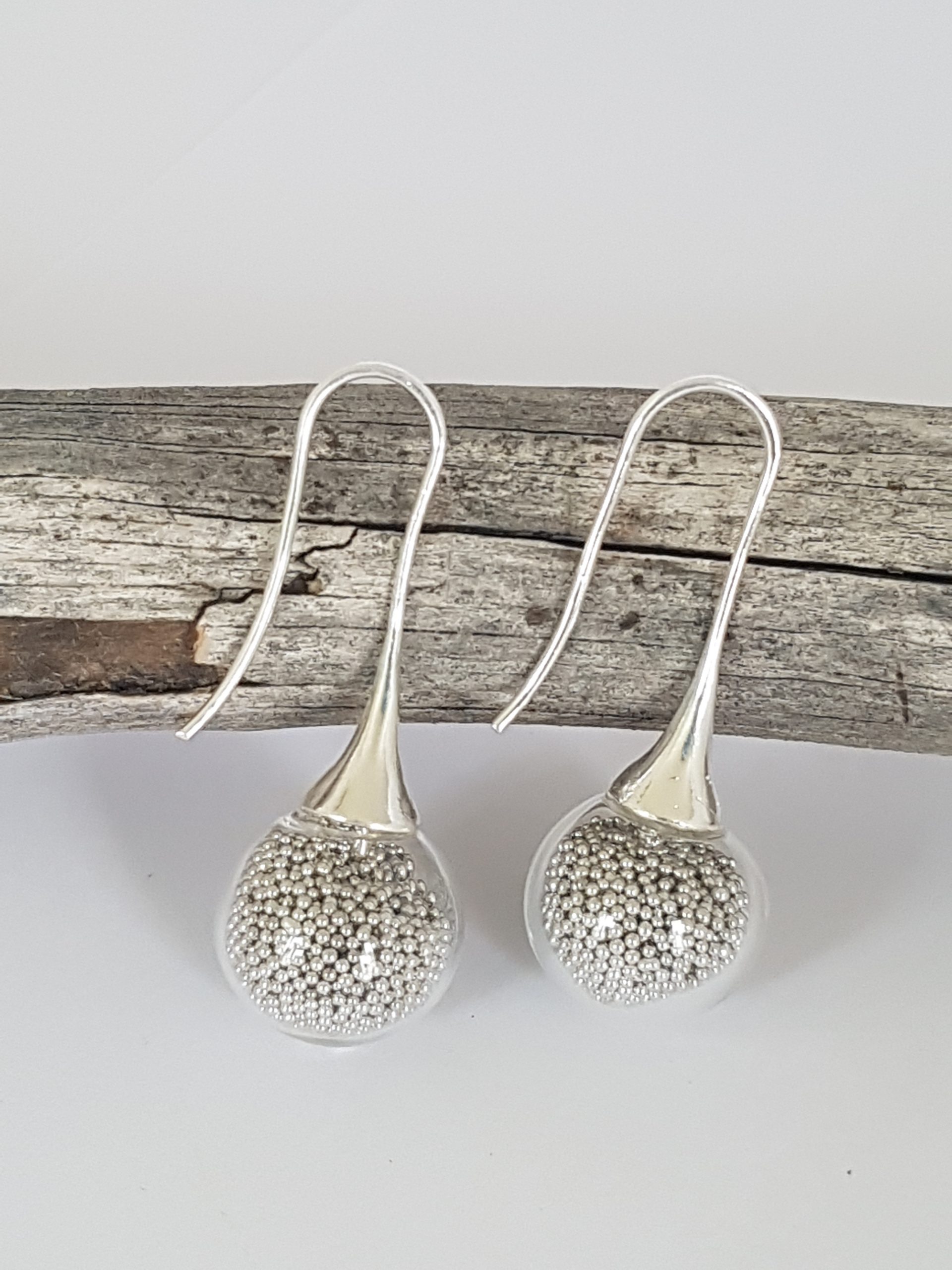 Boucles d’oreilles en verre soufflé remplies par nos soins de micro-billes gris.