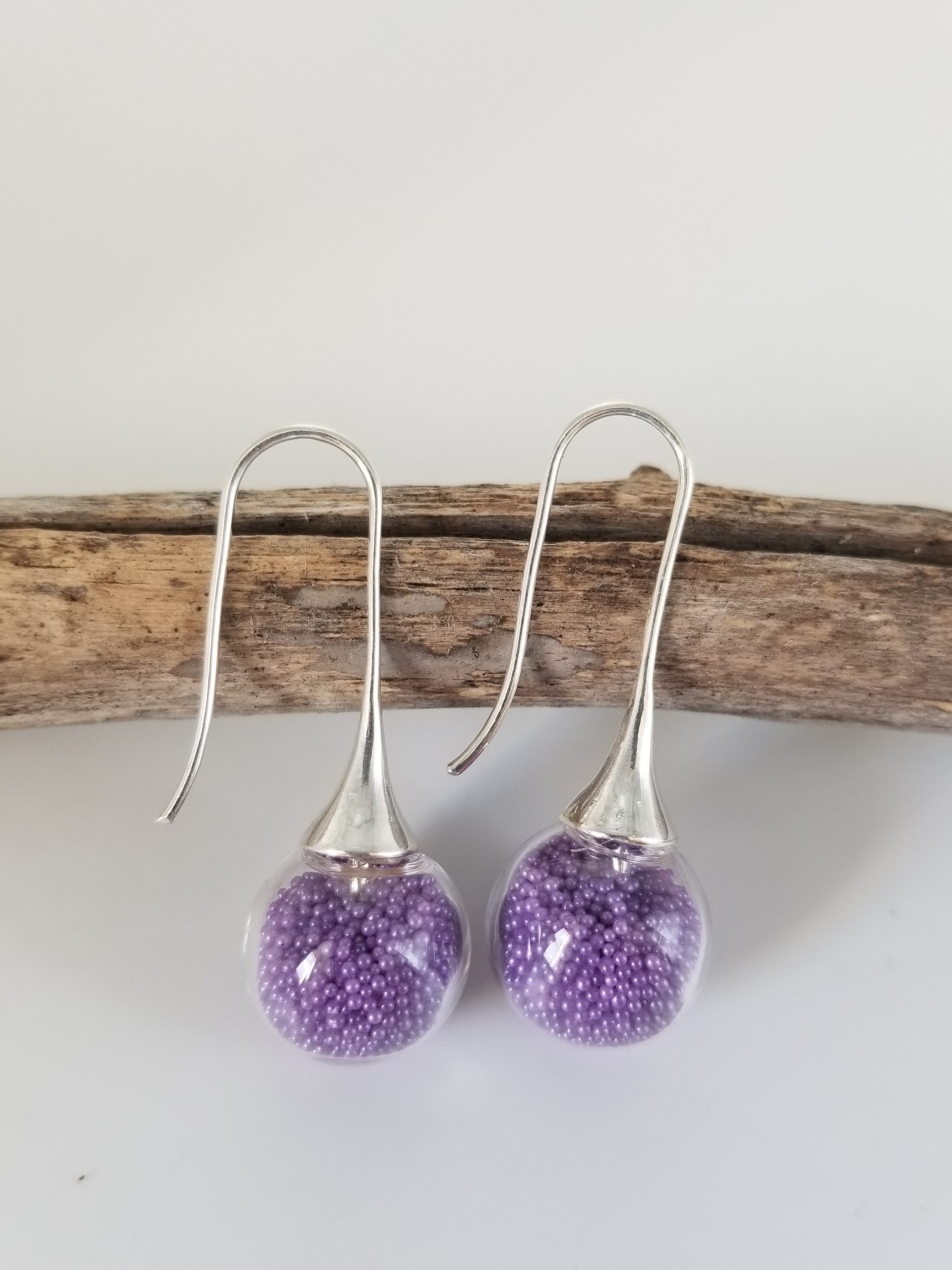 Boucles d’oreilles en verre soufflé remplies par nos soins de micro-billes mauve.