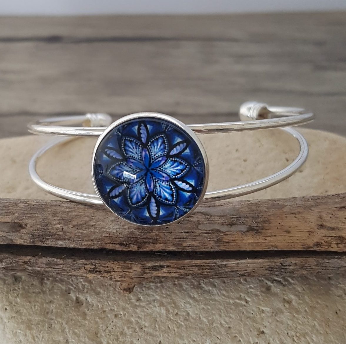 Bracelet réglable orné d’un cabochon mandala dans les camaïeux de marine le tout recouvert d’une fine couche de résine.